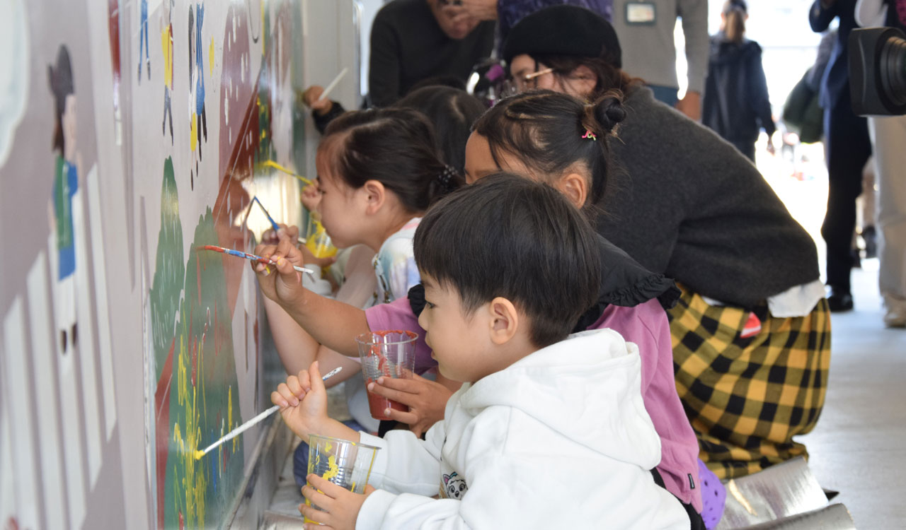 完成お披露目会では、壁画アートの仕上げとして地元の子どもたちに協力いただき、最後の筆入れを行いました。みな好きな色で葉っぱを塗ったり、花を描いたりする等して、楽しい時間となりました。
