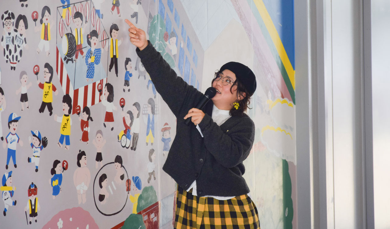 今回のお披露目会では、引き受けていただいた経緯や、デザインを固めるにあたり過去の資料を読んだり、古くからの住民に話を聞くなどして見聞を広めたことや、そこから得たイマジネーションを元に、当時の風景を表現したことなどを具体的に絵を指し示しながらお話いただきました。