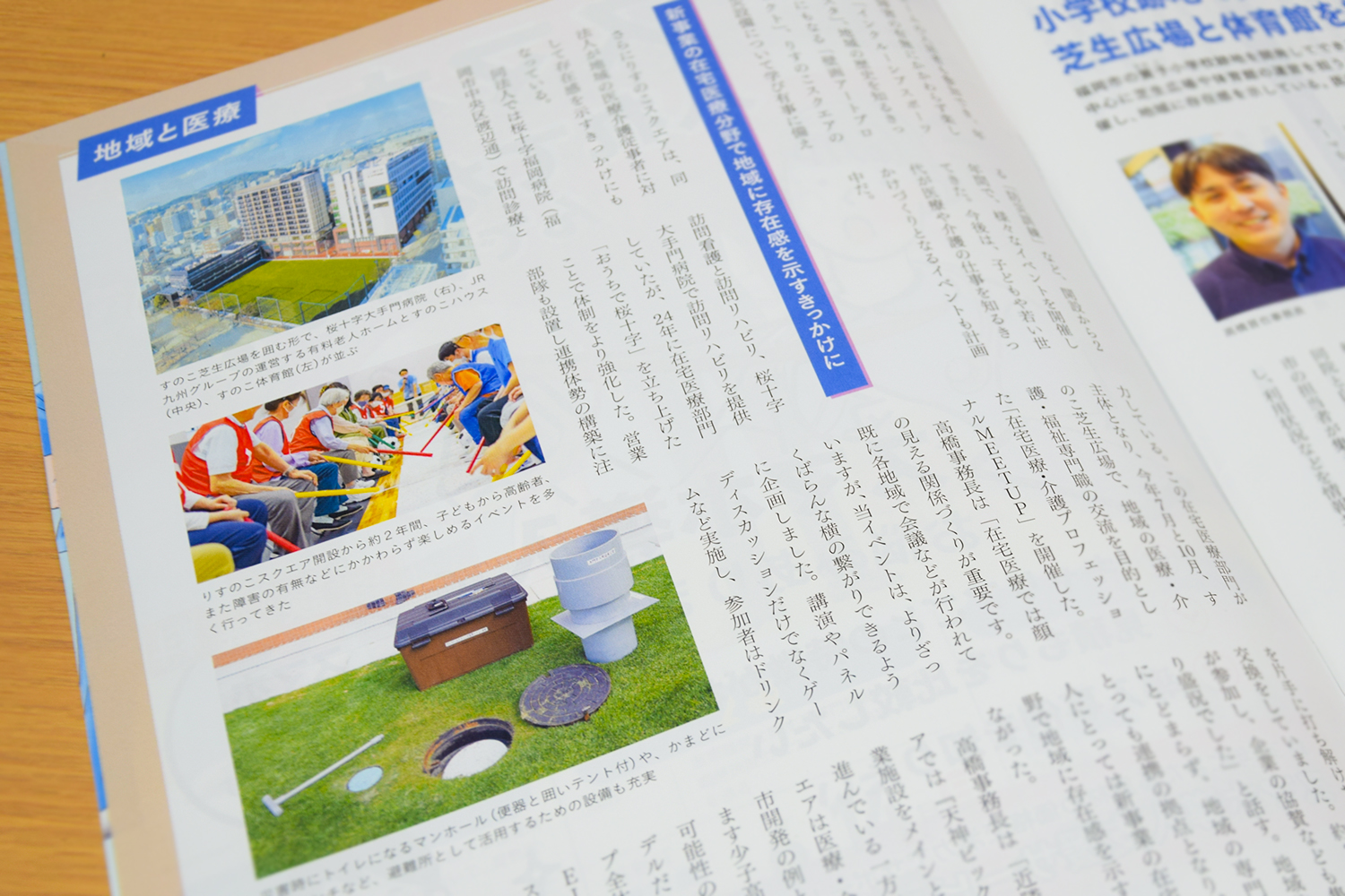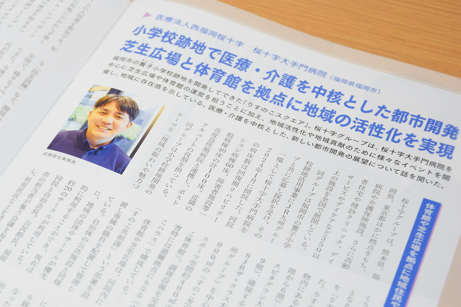『フェイズ・スリー』は、1984年創刊の日本初“病院経営”専門情報誌です。地域医療を特集する「地域と医療」ページのなかで、桜十字大手門病院とりすのこスクエアを取り上げていただき、簀子小学校跡地開発から約2年が経過したこれまでの取り組みについて、また地域とどう信頼関係を築いてきたのかについてご紹介いただきました。