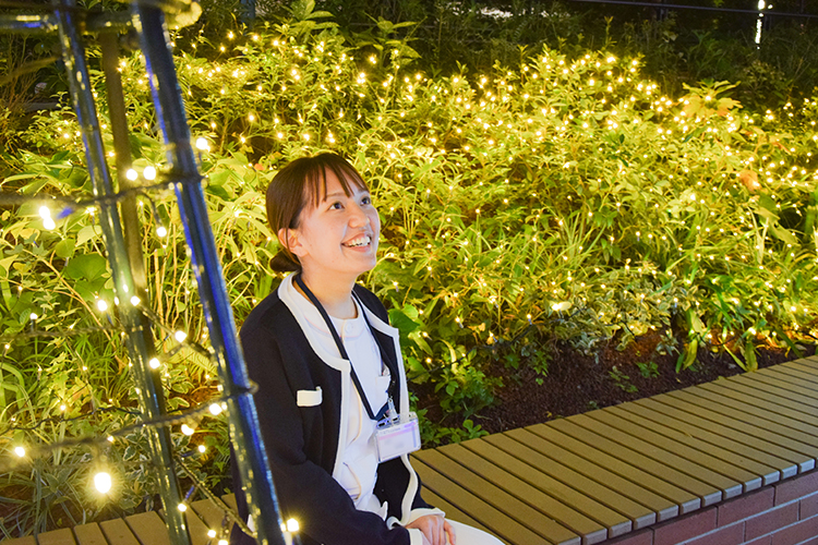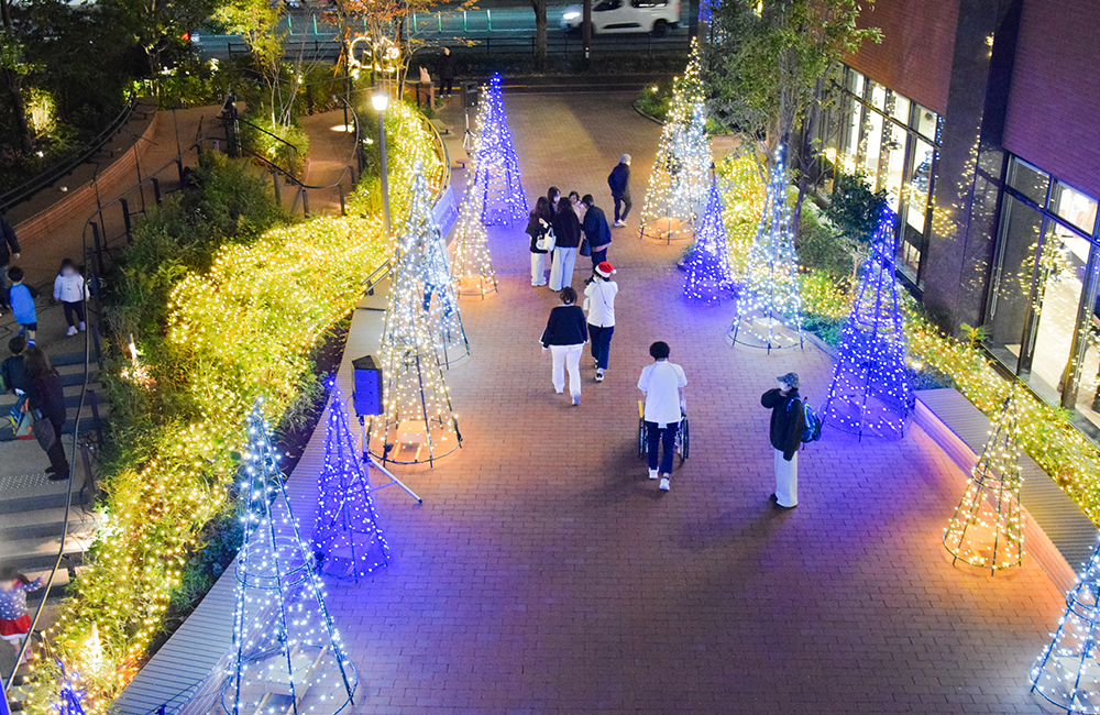 光がりすのこスクエア全体を美しく彩ると、人々の流れにも変化が。通勤・通学途中の方が中庭に立ち寄り、友達同士で写真を撮りあったり、公園で遊んでいた子どもたちがイルミネーションの点灯に気づき、中庭で駆けまわり、患者さまや職員とコミュニケーションを取る様子が見られました。